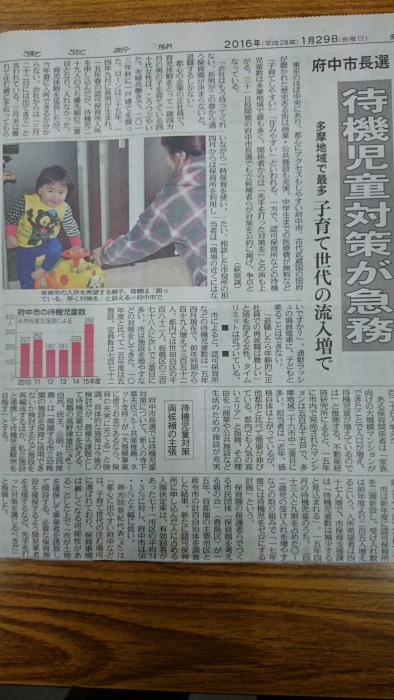 いよいよ府中市長選挙まであと2日、今朝(29日)の東京新聞朝刊の多摩版には、保育所に入所できないお母さんの記事が掲載されています。これは、先日の読売新聞で掲載された記事が、他社のマスコミにも大きく影響をあたえていることを証明しています。市長選挙終盤にかけて、保育所増設待機児童問題が世論に広がっていることの意味します。そこで、寺下章夫候補が主張している4つの政策実現の一番目にあげているのが、この認可保育所の増設で待機児童ゼロの主張です。あわせて寺下候補は、保育士さんを確保する手立てとして、現状の保育士さんの劣悪な労働条件改善と賃金引上げを、自治体の責任で行うことも訴えています。三多摩でワーストワンの待機児童を抱える府中市の不名誉な記録を、寺下市長実現で返上しようではありませんか。大規模事業に偏った現市政から、市民住民の暮らしと命を守る市政、憲法が府中市民の隅々にまでいかされる市政のために、寺下章夫さんへのご支持の輪を広げてください