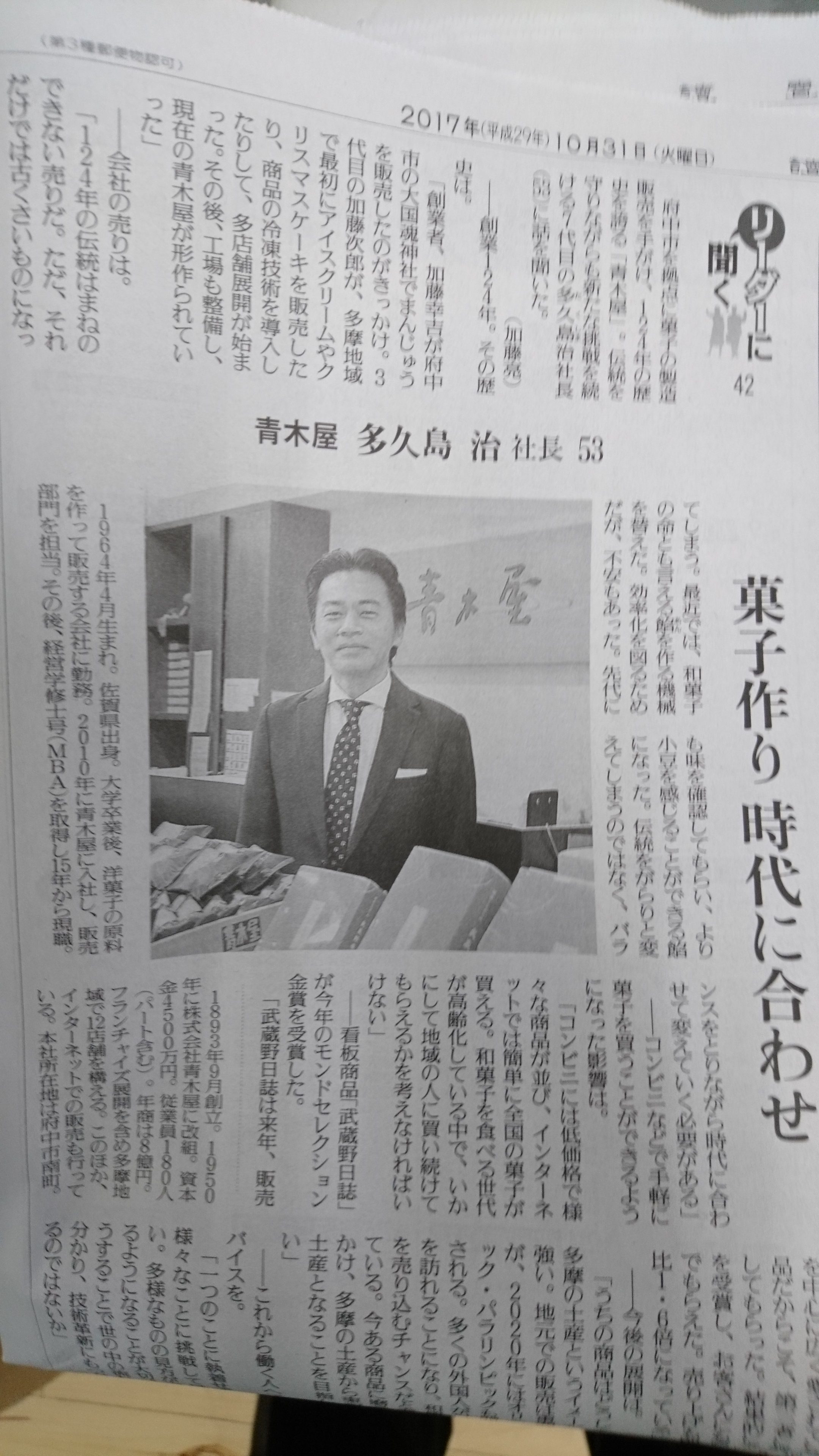 今朝(31日)の読売新聞多摩版に、府中市を拠点に菓子の製造販売を手掛けて124年の歴史を誇る「青木屋」の多久島(たくしま)治社長のインタビュー記事が掲載されています(「リーダーに聞く」)。記事で多久島社長は「124年の伝統はまねができない売りだ。ただ、それだけでは古くさいものになってしまう」「和菓子を食べる世代が高齢化している中で、いかにして地域の人に買い続けてもらえるかを考えなければならない」と語っています。