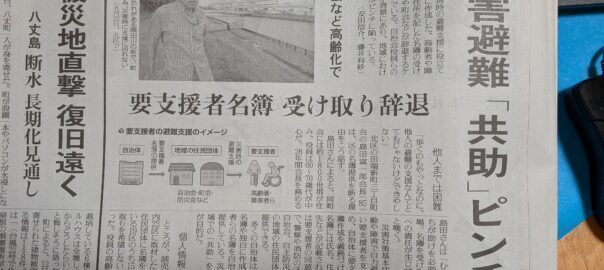 今朝の読売新聞多摩版に、自治体が災害時の避難支援に役立ててもらうために作成した、高齢者や障碍者の氏名、住所を作成した名簿の受け取りを自治会、町会などが辞退するケースが増えているとの記事があります。「自治会役員らの高齢化などが背景にあり、地域における助け合いがピンチに陥っている」状況が掲載されています。