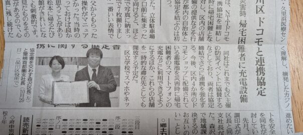 先日の読売新聞多摩版に都内の品川区が、NTTドコモとの間で「災害時に帰宅困難となった人に対して、区内の店舗で充電設備の提供などを行う」との内容の包括連携協定を締結したとあります。記事によると同社が都内の自治体とこうした連携協定を結ぶのは初だそうです。
