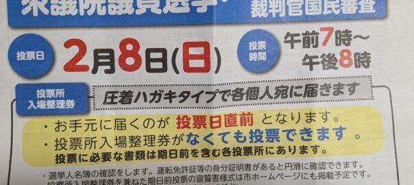 府中市では告示前までに、今回の総選挙の投票に関するお知らせチラシを全戸配布していますので、ご覧ください。それによると、投票所の入場整理券については、①圧着ハガキタイプで各個人あてに届くとのことで、②入場整理券がお手元に届くのが投票日直前となること、③投票所入場整理券がなくても投票ができるとなっています。④選挙公報については、2月6日までみすべての世帯に配布するとしています。